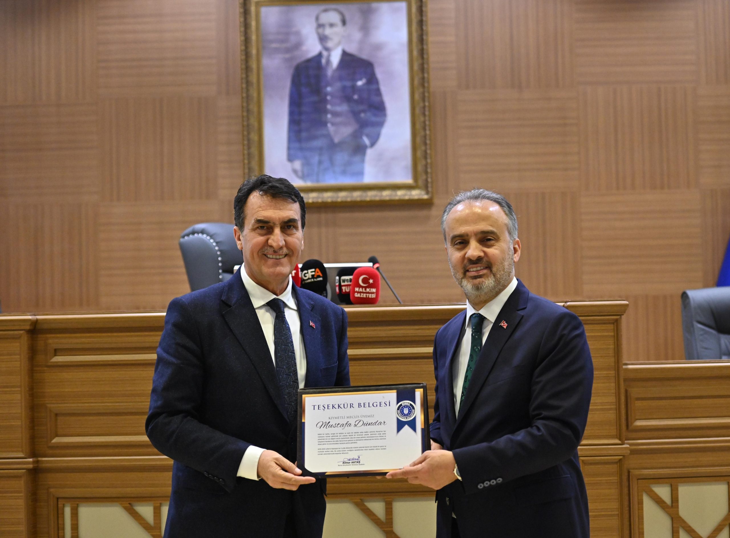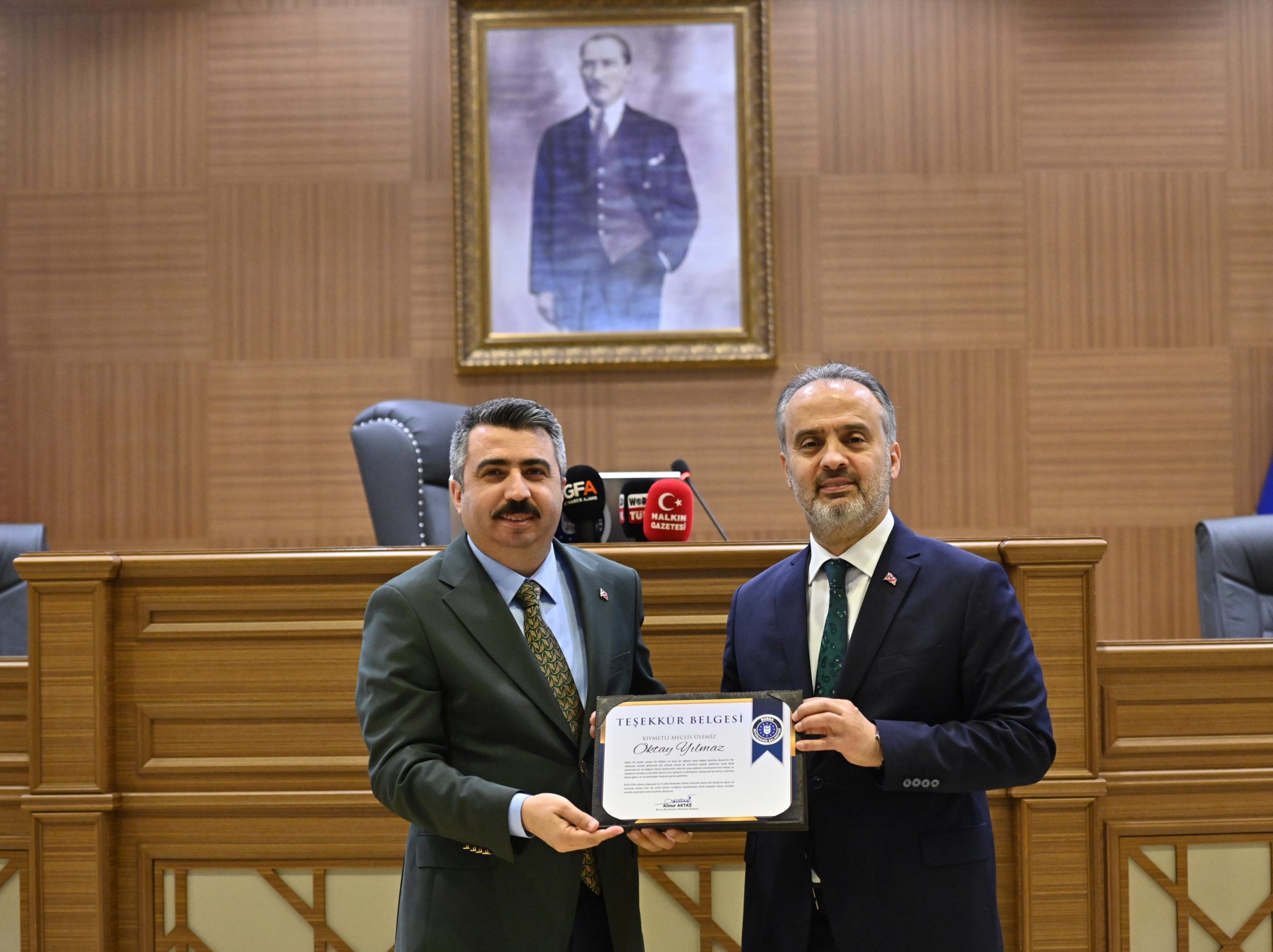 Bursa Büyükşehir Belediyesi’nin 2019-2024 dönemi son meclis toplantısında konuşan Başkan Alinur Aktaş, “5 sene boyunca şehrimize değer katmak için gayret ettik. Biz büyük bir aileyiz ve bu ailenin üyeleri olarak şehrimizin bugününü birlikte ihya ettik. Yarınlarına da birlikte karar verdik” dedi. Başkanı Aktaş, daha sonra meclis üyelerine birer teşekkür plaketi verdi.