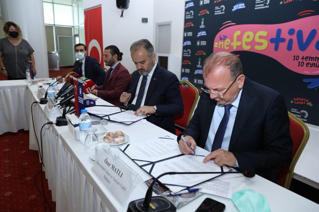 Bursa’da pandemiden ekonomik anlamda olumsuz etkilenen vatandaşlar ve esnafa yönelik bu güne kadar toplamda 170 milyon TL’lik destek sağlayan Bursa Büyükşehir Belediyesi, süreçten en fazla etkilenen sanatçıları da unutmadı. Mart ayında “Bursa’nın Her Sokağı Ayrı Bir Şarkı” projesiyle sokak sanatçılarına sağlıklı ortamda sanatlarını icra etme imkanı sunan Büyükşehir Belediyesi, geçtiğimiz ay yapılan Sokak Sanatçıları Festivali’nin ardından şimdi de yerel sanatçılar için yeni bir destek paketini devreye aldı. Bursa’nın merkez ve 17 ilçesini Eylül ayı sonuna kadar açık hava sanat etkinlikleriyle buluşturacak ‘Birnefestival’ programı düzenlenen basın toplantısı ile kamuoyuna duyuruldu. Toplantı öncesi Bursa Büyükşehir Belediye Başkanı Alinur Aktaş, Bursa Kültür Sanat ve Turizm Vakfı Başkanı Özer Matlı ve Güney Marmara Tiyatro Kooperatifi Başkanı Mustafa Yıldırım arasında işbirliği protokolü imzalandı.