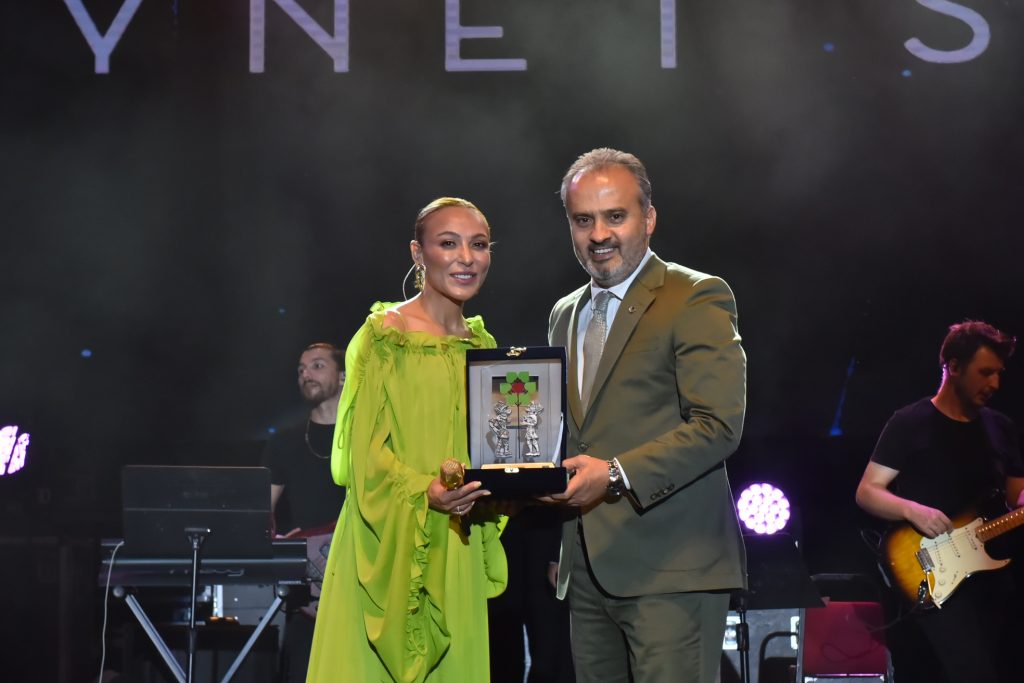 Büyükşehir Belediye Başkanı Alinur Aktaş da ünlü sanatçıya şarkıları ve güzel sesi ile Bursalılara yaşattığı müzik ziyafeti için şükranlarını sunarak Bursa hatırası olarak BKSTV’nin Hacivat – Karagöz figürlü plaketini verdi. Konseri AK Parti İl Başkanı Davut Gürkan ile BKSTV Yönetim Kurulu Başkanvekili Ömer Kumova da izledi.