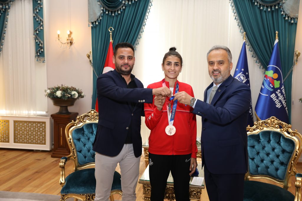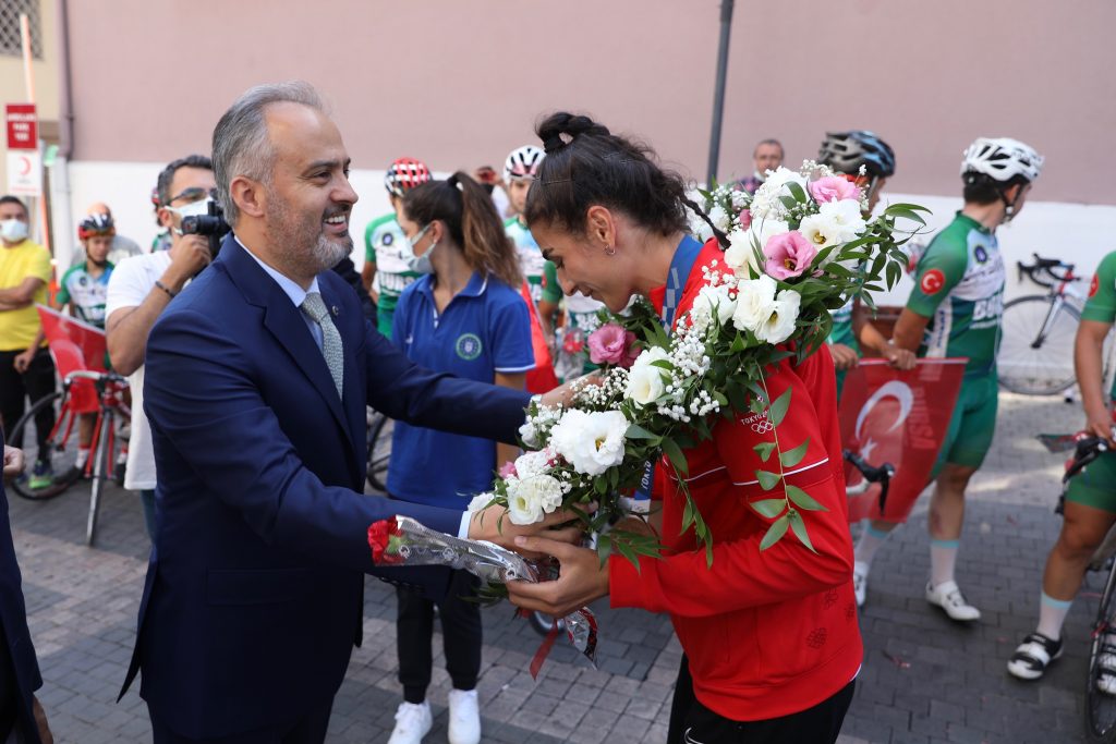 Daha sonra Bursa’ya geçen Hatice Kübra İlgün, Tarihi Belediye Binası önünde kendisini bekleyen genç sporcuların alkışları arasında araçtan inerek Bursa Büyükşehir belediye Başkanı Alinur Aktaş tarafından karşılandı. Başarılı sporcuyu Büyük Salon’da kabul eden Başkan Alinur Aktaş, özel bir başarı elde eden Hatice Kübra İlgün’ü yönetmelikle daha önceden belirlenen para ödülü yerine daire hediye ederek taltif edeceklerini belirtti.