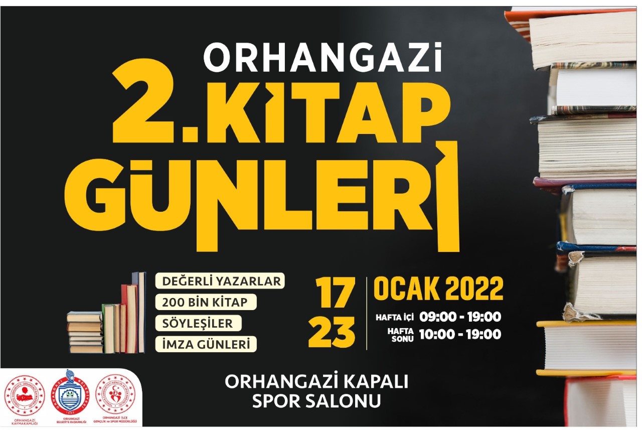 Orhangazi Belediyesi tarafından bu yıl ikincisi düzenlenen ve Türkiyenin önde gelen yayınevleri, Yazarlarının katılacağı Orhangazi Belediyesi 2. Kitap Günleri başlıyor. Geçen yıl pandemi tedbirleri doğrultusunda yapılamayan Kitap Günlerinin ikincisi 17-23 Ocak tarihleri arasında Orhangazi Kapalı Spor Salonunda gerçekleşecektir.