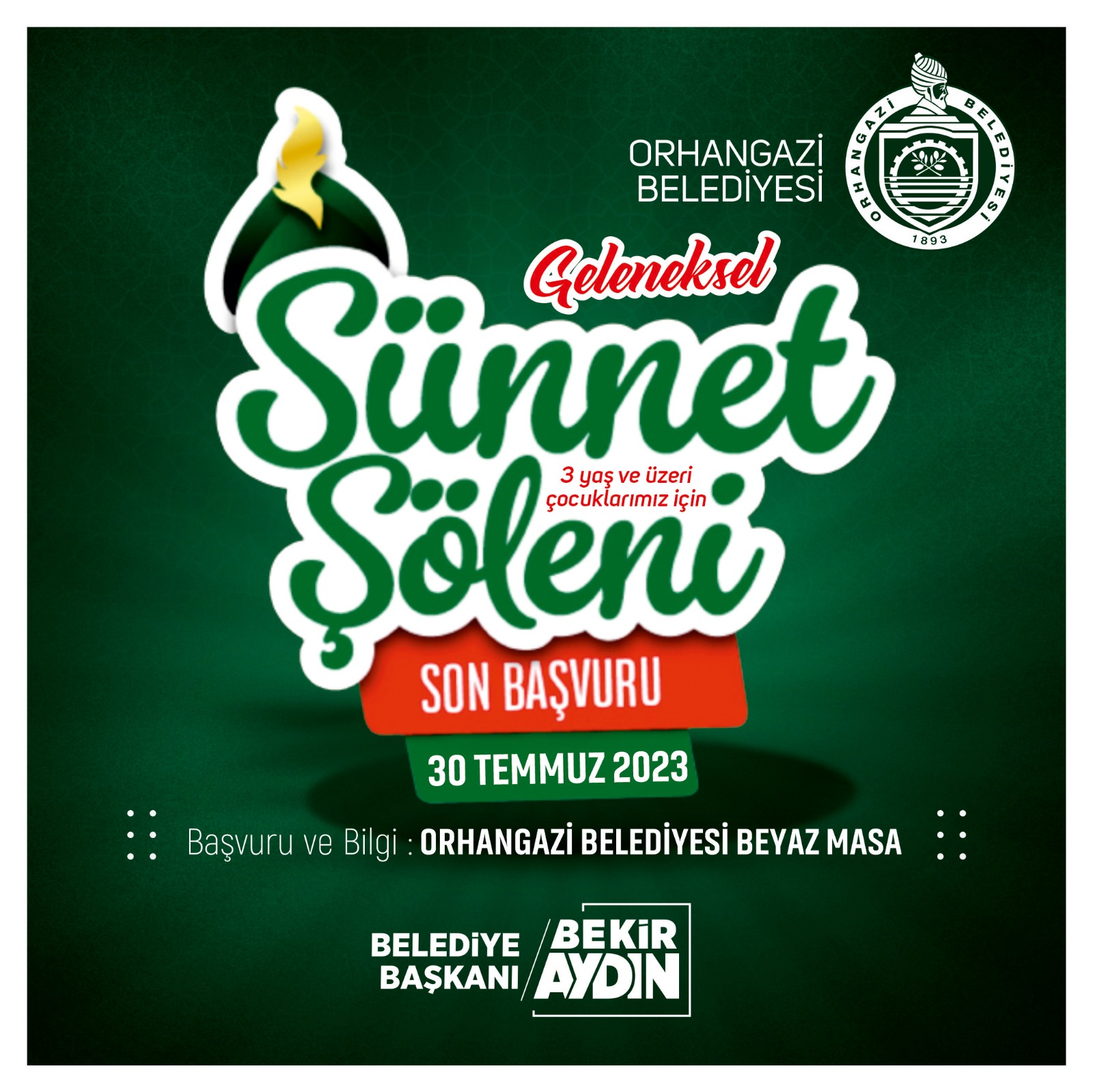 Geleneksel hale gelen Sünnet Şöleni için Son kayıt süresi ise 30 Temmuz’da son bulacaktır. Sünnet için başvurular Orhangazi Belediyesi Beyaz Masa tarafından kayıt alınacaktır.