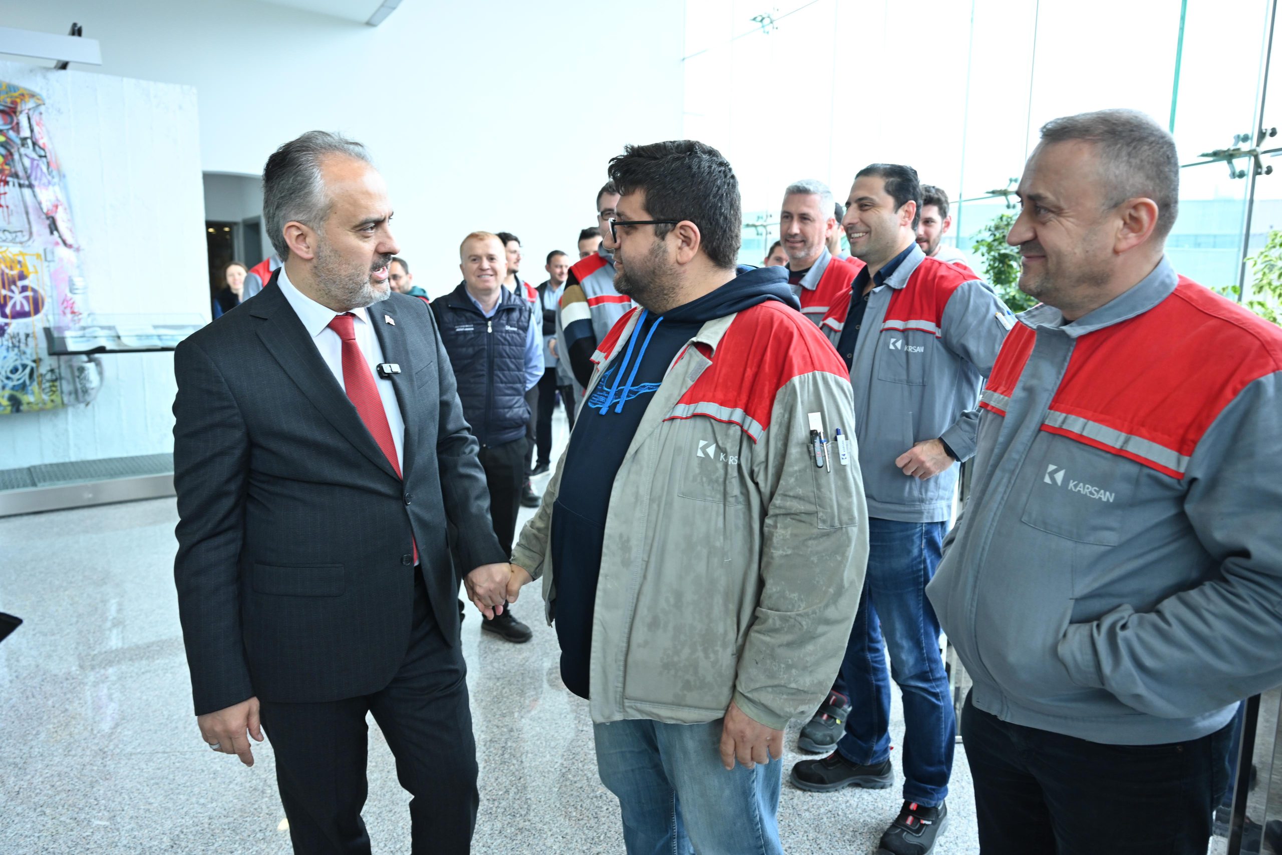 Bursa’da ulaşım meselesinin çözümü için raylı sistem, yeni yollar, köprü ve kavşak yatırımlarını sürdüren Büyükşehir Belediyesi, diğer taraftan şehirde toplu ulaşım kültürünün yaygınlaşmasına yönelik çalışmaları da hayata geçiriyor. Trafiğe kayıtlı aracın 1 milyonu aştığı ve araç sayısının da her yıl 30-40 bin arttığı Bursa’da, her gün toplu taşıma araçlarında 1 milyondan fazla insan taşınıyor. Türkiye’nin en genç otobüs filosuna sahip Bursa’da ‘elektrikli otobüs’ dönüşümünü başlatan Büyükşehir Belediyesi, yüzde yüz yerli üretim olan iki elektrikli otobüsü Karsan Fabrikası’ndaki törenle bünyesine kattı. Tören öncesinde Büyükşehir Belediye Başkanı Alinur Aktaş, beraberindeki Bursa Milletvekili Mustafa Varank, AK Parti İl Başkanı Davut Gürkan, Karsan CEO’su Okan Baş, AK Parti Nilüfer Belediyesi Başkan adayı Celil Çolak, Karsan yöneticileri ve siyasi parti temsilcileriyle birlikte fabrika çalışanlarıyla biraraya gelerek sohbet etti.